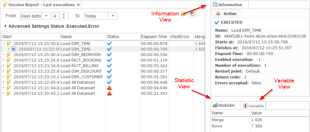 The Information view shows an overview of the selected steps. If the steps contain executed code (for example, a SQL command), it appears in this view in the Executed tab.