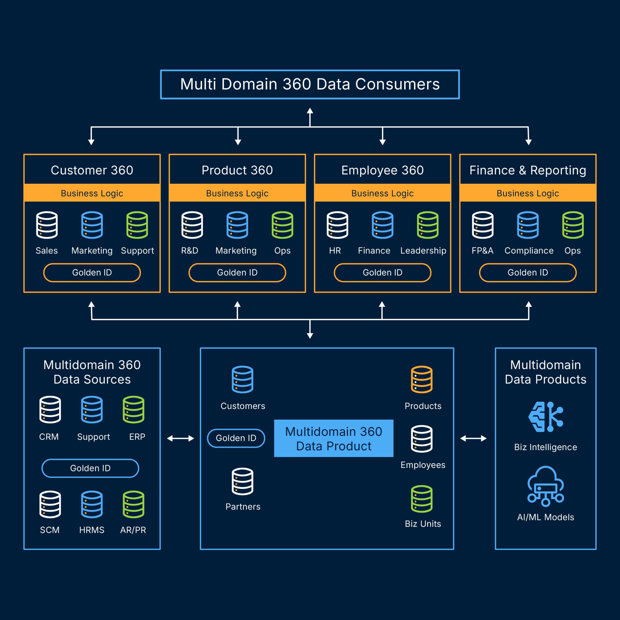 Merge data from multiple domains into one source of truth for cross-team and stakeholder collaboration. Create golden records of customer profiles, product catalogs, or location data with configurable models and validation rules.